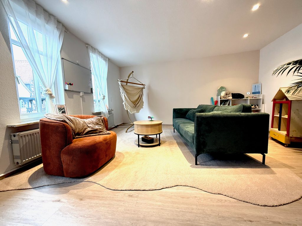 Das Gesprächssetting passt sich den unterschiedlichen Bedürfnissen an. Gerade Kinder kommen meist am Besten ins Gespräch, während sie in Bewegung sind oder sie etwas anderes machen. Entsprechend ist mein Raum eingerichtet. Mit Bewegungsmöglichkeiten, Spielangeboten und kindgerechten Materialien.